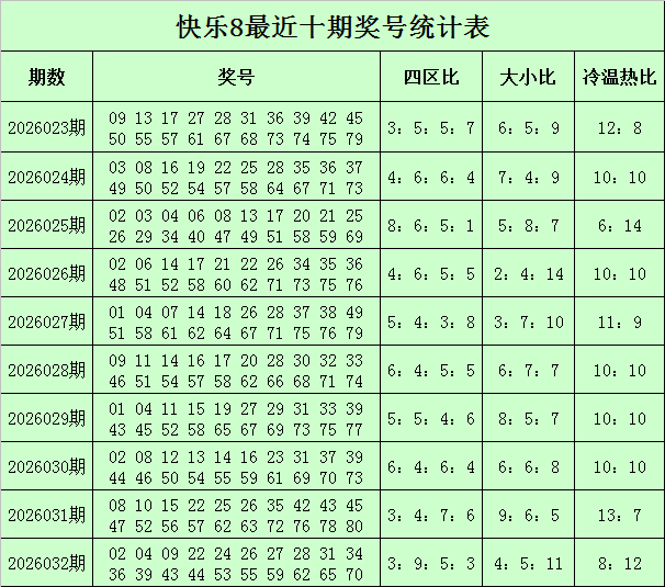福彩快乐8第2026032期开奖回顾:02 04 09 22 24 26 27 28 31 34 36 39 43 44 53 55 59 62 65 70,其中奖号四区比为3:9:5:3,冷温热码比为4:5:11,大小比为8:12,和值为733,同尾号码为02 22 62、43 53、04 24 34 44、55 65、26 36、09 39 59。