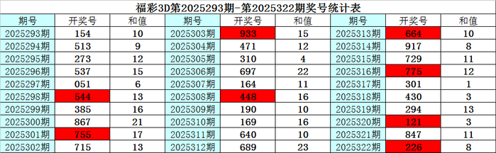 上期回顾:福彩3D第2025322期奖号为:226,其中奖号组选类型为:组三,奇偶比为0:3,大小比为1:2,012路比为1:0:2,和值为10,跨度为4。