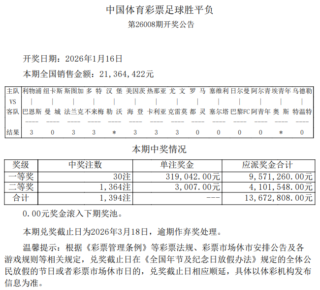 北京时间1月16日,胜负彩第26008期开奖结果揭晓。本期足彩头奖开出30注,单注奖金319,042元;二等奖开出1364注3007元;任九开2799注3779元。本期胜负彩销量为21,364,422元,任九投注总额为16,531,034元。