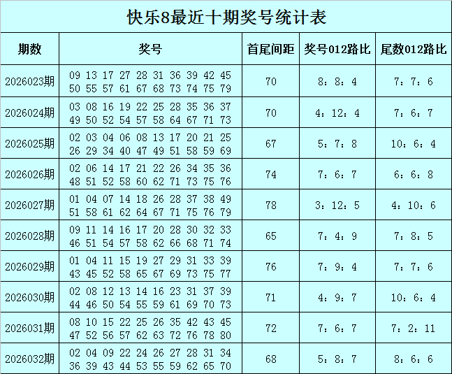 福彩快乐8第2026032期开出奖号:02 04 09 22 24 26 27 28 31 34 36 39 43 44 53 55 59 62 65 70,其中奖号012路比为5:8:7,尾数012路比为8:6:6。